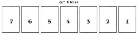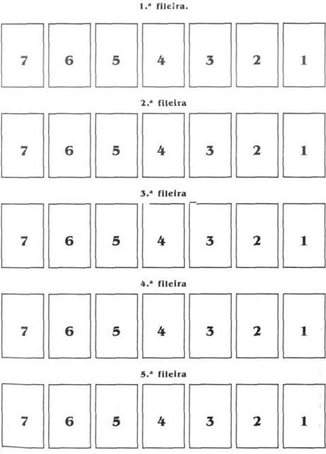 Teremos então seis fileiras horizontais de sete cartas cada uma, dispostas da seguinte maneira: