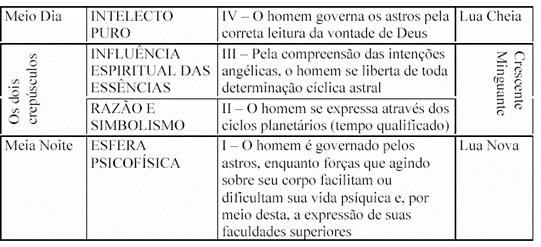 Tão estreita e inseparável é alias a integração entre todos esses conhecimentos que, só para dar um exemplo, cada uma das ciências em questão é representada por um dos planetas (a gramática pela Lua, a retórica por Vênus, a lógica por Mercúrio, a aritmética pelo Sol, a musica por Marte, a geometria por Júpiter, e a astrologia por Saturno) (5). O desconhecimento de qualquer delas, por parte do astrólogo, revelaria uma lacuna na sua compreensão do simbolismo do planeta que a representa, e não seria assim uma mera falha de erudição, exterior e casual, mas uma deficiência intrínseca do seu saber propriamente astrológico.