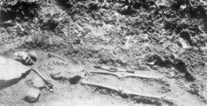 Esqueleto de uma jovem mulher encontrado entre as camadas de terra duma cisterna (9027), em Hazor, pelo arqueólogo Yigael Yadin e sua equipe.