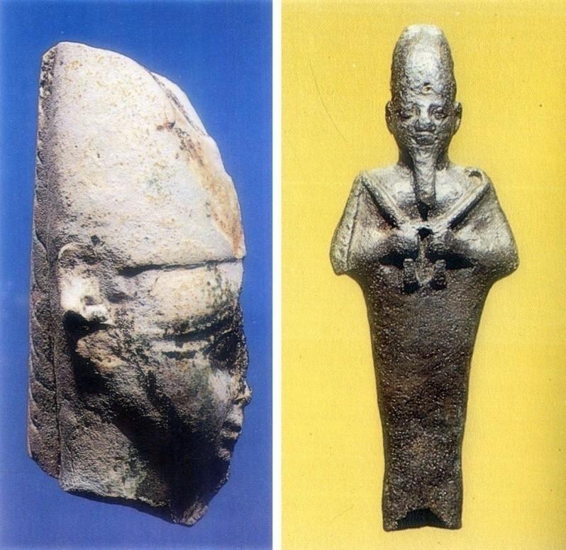 Rosto duma estátua de Osíris esculpida em faiança (séc. 9 ou 10 a.C.) e estátua de bronze de Osíris (séc. 4. ou 5 a.C.) cujos pés e a serpente decorativa da coroa (uraeus) foram danificados. Ambas foram encontradas em Tel Dan.