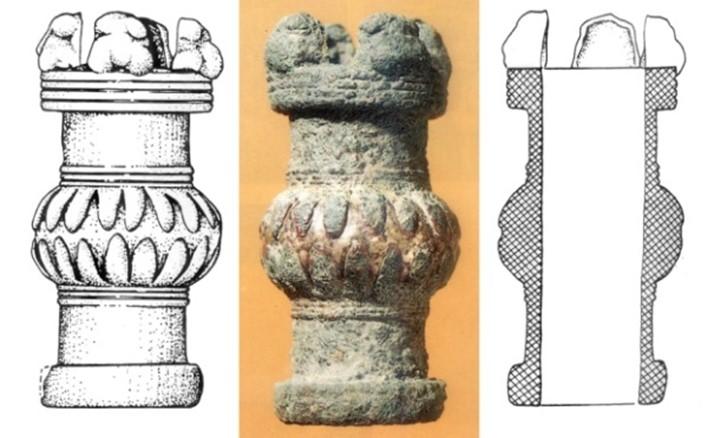 When we removed the stones of the altar for exhibition in the Skirball Museum in Jerusalem, the head of a scepter was discovered on the floor below. Made of bronze and hollow in the center, it is 9 cm. high and 3.7 cm. wide. Four badly corroded figures, possibly representing lion heads, jut out from the top of the artifact. Below the figures, three circular grooves from four veins, or rings, a motif that appears three more times on the scepter head. The middle section consists of a protruding bronze ring with silver leaves, and the base is a protruding flange. The discovery of the scepter head caused much excitement, for here was the head or top of a scepter similar to those held by kings and priests — and in the least one case, by a goddess[47].