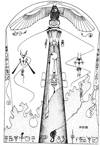 Operando para baixo a partir do Pylon de Daäth, representado pela Palavra, 462 Tiphareth surge abaixo do horizonte do Abismo como o Sol Negro, o símbolo do qual – a Coulevre Noire (Cobra Negra – N. do T.) – oculta o êxtase do ‘deus horrendo’463 cuja imagem é o reverso da Beleza tipificada por Tiphareth no mundo da existência fenomênica.