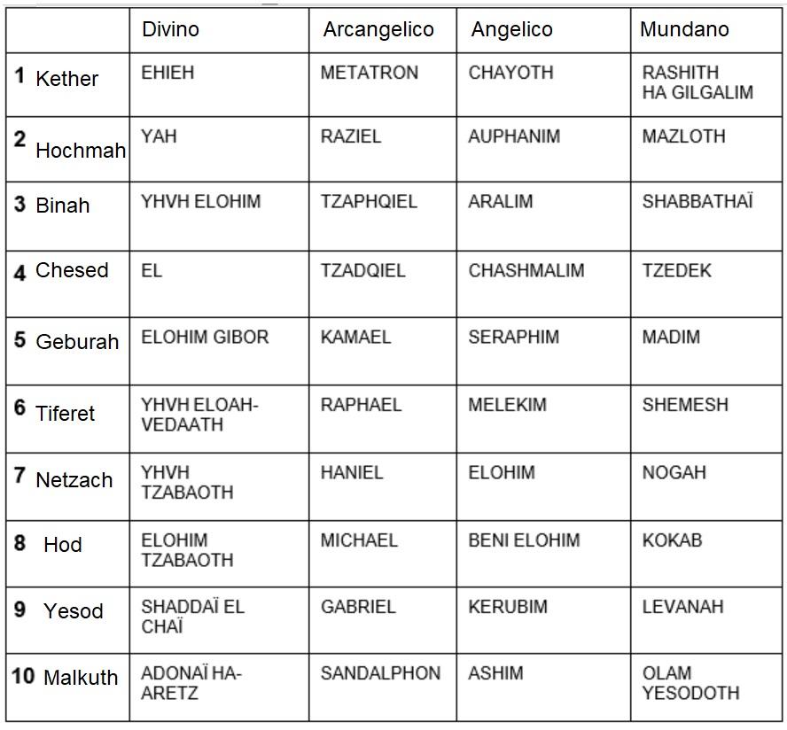 Escolha o seu símbolo para meditação. Entoe os quatro Nomes Divinos, indo do Divino ao Mundano. Conforme a tabela abaixo: