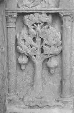 Duas árvores presentes em baixos relevos, aliás muito diferentes, ainda prendem nossa atenção. O primeiro é obviamente um carvalho, pois tem duas bolotas que são desproporcionalmente proeminentes, dado o pequeno tamanho da árvore. É provavelmente um carvalho de Kermès (“qu’Hermès”) cujos frutos aqui simbolizam os dois primeiros materiais minerais da Grande Obra Alquímica.