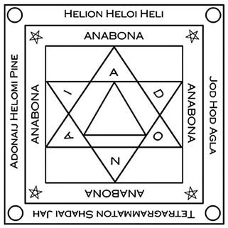 E entre a primeira e as outras partes, marca o pentáculo de Salomão, assim: e entre o primeiro quadrante escreve a palavra ANABONA, e no meio do Almadel constrói a figura do hexágrama , e no meio deste, deverá haver um triângulo, onde devem está escrito estes nomes de Deus HELL, HELION, ADONAI, e ao redor desta figura de seis ângulos, deverá ficar como está no exemplo.