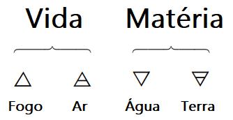 Dois elementos estão ativos: Fogo e Água. Dois elementos são passivos: Ar e Terra. Dois elementos pertencem ao domínio da Vida: Fogo e Ar, dois ao da matéria: Água e Terra. Temos assim:
