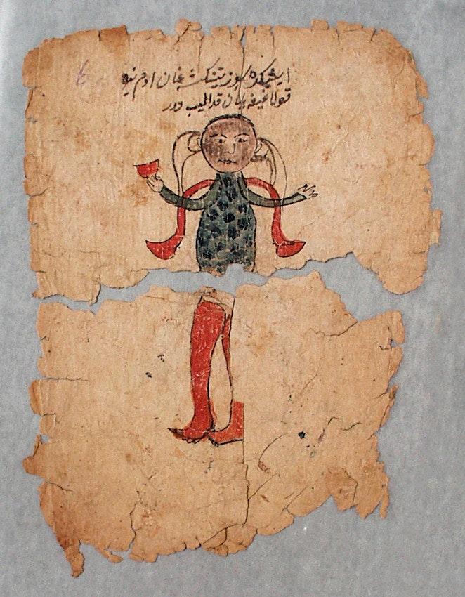 turkic M.73.5.581e: Figura acima à esquerda: “Eles torturam um homem ou mulher que teve relações sexuais durante a menstruação ou o período após o parto, puxando sua língua para fora do pescoço”. Figura acima à direita: “anjo” [ḥayż nifāsniŋ ičida er maẓlūm jimāʿ qilġan kišiniŋ tilini kičkäsidin tartip ʿaẕāb qilur