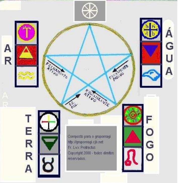 Em cada retângulo nas pontas do pentagrama, exceto pela roda do espírito, você tem o símbolo do elemento como no sistema enochiano, o símbolo no sistema esotérico comum e o sigilo a ser desenhado no centro do pentagrama.