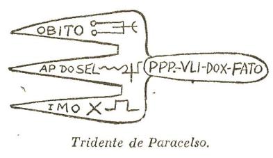 TRIDENTE DE PARACELSO — É comum ver-se em quase todos os pontos riscados de Exus, um tridente que assemelhando-se a um garfo de três pontas, é por alguns interpretado como o garfo de Satanaz. Esse tridente, na interpretação dada na Alta Magia, significa a figura do ternário. É formado por três dentes em forma de pirâmides, sobrepostos a um “tau” grego ou latino. No primeiro dente (parte de cima), vê-se um “jod” que atravessa de um lado um crescente (meia lua), e do outro uma linha transversal, assemelhando-se hieroglificamente ao signo zodiacal do câncer (caranguejo). No dente central está representada hieroglificamente a figura da serpente celeste, sendo a cabeça representada pelo sinal de Júpiter. No terceiro dente (parte de baixo) vê-se um sinal misto, representando os signos de Geminis e de Leo (Gêmeos e Leão). No primeiro dente, entre os ferrões do caranguejo vê-se o Sol e a seguir, a palavra ÓBITO, que significa: vai-te, afasta-te. No dente do meio vê-se ainda no centro e perto da serpente, a frase: AP DO SEL que é a abreviatura de uma palavra formada kabalística e hebraicamente, e ainda de uma palavra vulgar. AP é a abreviatura da palavra ARCHEU e deve ser lida AR em vez de OP. DO ceve ser lido OD, e, finalmente SEL. Essas palavras representam as três substâncias primas e os nomes ocultos de Archeu e de Od, significando o mesmo que Enxofre e Mercúrio dos filósofos. No último dente vê-se ainda ao lado do leão, a palavra IMO que significa: não obstante, persiste. Na haste de ferro representada pelo “tau” grego ou latino, vemos três letras P. P. P. representando: hieróglifo faloide e linguâmico, seguindo-se depois as palavras: VLI DOX FATO as quais devem ser lidas tomando-se a primeira letra pelo número do pentagrama em algarismo romano, completando-se assim: PENTAGRAMATICA LIBERTATE DOXA FATO, que são caracteres equivalentes às três letras de Cagliostro, L. P. D., significando: liberdade, poder e dever, Concluindo-se, interpretamos o Tridente de Paracelso da seguinte maneira: De um lado, temos a liberdade absoluta; do outro, vê-se a necessidade ou a fatalidade invencível que a todos atinge; no meio, está a RAZÃO, ou o absoluto kabalístico que mantém o perfeito equilíbrio universal.