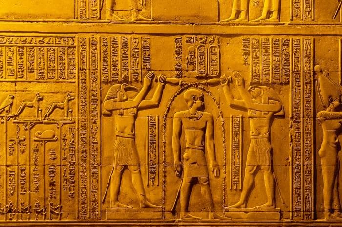 Segue a tradução: “Estou no templo dos grandes deuses / Eu guardo o segredo dos grandes deuses / Por vosso decreto zeloso, que eu viva e tenha saúde / Que meu trajeto seja favorável, meu caminho seja reto. // Dai luz a este ritual / Que eu seja plenamente satisfeito em caminhar radiante à vossa frente. / Dai vida a este ritual / E que minha voz seja agradável a meu deus e minha deusa. // Que os céus se regozijem, e a terra se alegre convosco / Que eu proclame vosso louvor para sempre.”