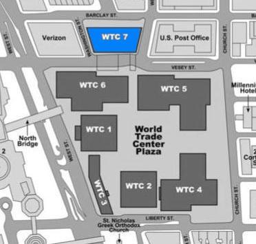 As Torres Gêmeas eras os quadradinhos WTC1 e WTC2, além dos outros quatro edifícios que ocupavam essa mesma quadra, havia o WTC7 que ficava do outro lado da rua. Ele era uma estrutura de aço e concreto de 47 andares cobrindo uma área de 158.000 m². Ele não foi atingido por nenhum avião e não foi atingido por nenhum destroço do WTC1 e WTC2. Inclusive, se reparar, ele estava protegido não só pela distância, mas haviam o WTC6 e o WTC5 formando uma berreira entre o WTC7 e as Torres Gêmeas. Todos os outros edifícios 3,4,5,e 6, que estavam mais próximos, foram atingidos pelos destroços e nenhum deles caiu. Resumindo, o WTC7 estava situado em outro quarteirão, era o edifícios do complexo mais distante das Torres Gemeas e estava protegido delas pelos WTC 5 e 6.