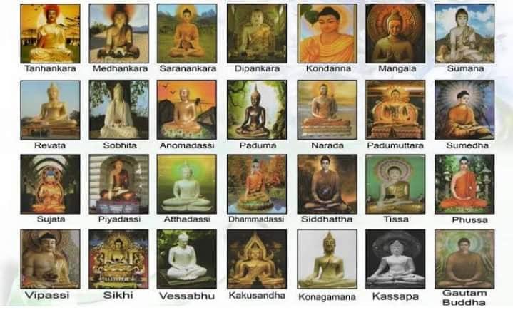 A tradição budista theravada preserva o nome de 28 Budas, bem como nome das árvores sob as quais obtiveram a Iluminação (todo Buda obtêm a inteligência suprema sob a sombra de uma certa árvore) , o nome de seus pais e de seus principais discípulos. Esses 28 Budas são: Buda Taṇhaṅkara, Buda Medhaṅkara, Buda Saraṇkara, Buda Dīpankara, Buda Koṇdañña, Buda Maṅgala, Buda Sumana, Buda Revata, Buda Sobhita, Buda Anomadassi, Buda Paduma, Buda Nārada, Buda Padumuttara, Buda Sumedha, Buda Sujāta, Buda Piyadassi, Buda Atthadassi , Buda Dhammadassī, Buda Siddhattha, Buda Tissa, Buda Phussa, Buda Vipassī, Buda Sikhī, Buda Vessabhū, Buda Kakusandha, Buda Koṇāgamana, Buda Kassapa, terminando com Buda Gautama, fundador do budismo atual.