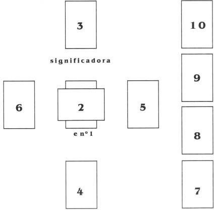 As cartas estão agora dispostas em forma de cruz, cujo centro é a Significadora, coberta pela Primeira Carta.
