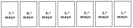 Toma-se o primeiro maço, estendem- se as cartas na mesa em fileira, da direita para a esquerda; colocam-se as cartas do segundo maço sobre elas, e depois sucessivamente as dos outros maços. Formar-se-ão assim sete novos maços de seis cartas cada um, dispostos da seguinte maneira:
