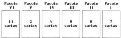 O Pacote I consiste das primeiras SETE CARTAS; o Pacote II consiste das SEIS CARTAS seguintes; o Pacote III das CINCO CARTAS seguintes; o Pacote IV das QUATRO CARTAS seguintes; o Pacote V das DUAS CARTAS seguintes, e o Pacote VI contém as últimas ONZE CARTAS. A disposição será então a seguinte: