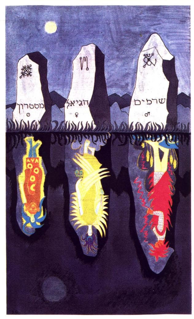 Se o mar e a lua são considerados os símbolos da argila mística que requer o sopro da vida para entrar nela para sua animação, ou se eles são considerados símbolos dos estados astrais e pré-físicos de consciência, não é de grande importância. O que importa é que uma certa forma ou imagem seja usada como um foco para a energia que ela mais tarde expressa e através da qual ocorre a mutação para outras formas. Nas versões posteriores, solares, da cosmologia mística, o próprio homem tenta a vivificação das imagens. Isso ele faz por meio da manipulação das substâncias astrais e físicas da manifestação. Segundo as doutrinas gnósticas de Saturnino e Basilides, sete anjos — liderados por Ialdabaoth — disseram: “Venha, façamos o homem à nossa imagem”, e formaram um ser de tamanho imenso, que mesmo assim só poderia rastejar pelo chão até o próprio Criador o houvesse dotado de fôlego ou espírito. Em outras palavras, não bastava que uma forma tivesse sido criada; precisava ser impregnada com o pneuma ou prana, a matéria tinha que ser espiritualizada antes que pudesse elevar-se acima da criação animal e sair como homem.