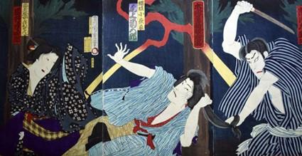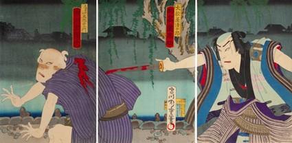 Atores Ôtani Tomoemon IV, Arashi Rikan III, e Ichikawa Kodanii IV interpretando os papéis de Adachi Motoemon, Hayase Iori e Tôma Saburôemon no terceiro ato do drama Katakiuchi Tenga Jaya Mura (敵 討 天下 茶屋 聚), que foi encenado no 5º mês lunar de 1854 no Kawarasakiza (gravura impressa por Utagawa Kuniyoshi).
