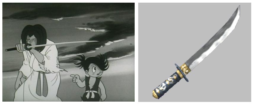 Tanosuke portando a espada yōtōnihiru numa cena do sétimo episódio de Dororo (どろろ; 1969) e yōtōmuramasa no jogo Akumajō Dracula: Yami no Juin (悪魔城ドラキュラ 闇の呪印; 2005).