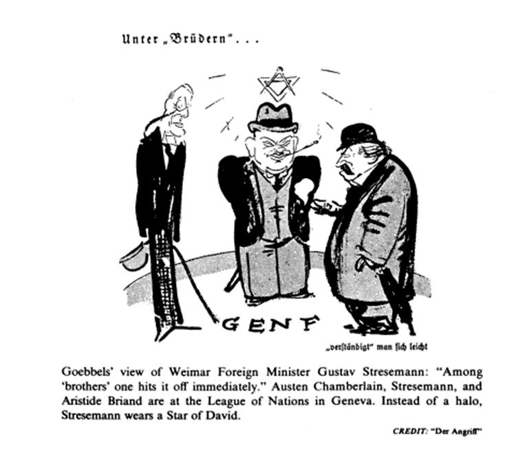 Observe que na legenda, Herzstein identificou o símbolo acima da cabeça de Stresemann como a Estrela de David; no entanto, uma inspeção mais detalhada revelou que o símbolo não era a Estrela de Davi, mas o compasso e o esquadro; símbolo dos maçons (aos quais pertencia Stresemann). Agora, separadamente, os temas da Alemanha nazista e da Maçonaria ocupam estantes inteiras de material impresso e milhares de horas de filmes e documentários, mas surpreendentemente não há praticamente nada que examine os dois juntos. Textos de pesquisa sobre o Terceiro Reich e o Holocausto mencionam a Maçonaria, mas apenas de passagem.[3] Frequentemente, a maior parte da informação que pode ser encontrada na literatura secundária vem de livros sobre as igrejas cristãs sob Hitler,[4] o que é enganoso e injusto. Embora exija que seus membros acreditem em Deus, a Maçonaria não é, nem jamais afirmou ser uma religião. As histórias gerais da Maçonaria também sofrem da mesma escassez.[5] De toda a literatura disponível sobre os maçons na Alemanha nazista, o que é erudito não está em inglês e o que está em inglês não é erudito. Além disso, com exceção de Konflikt und Anpassung de Ralf Melzer, tudo havia sido publicado por uma editora maçônica.[6] Além de Melzer, apenas o livro Freimaurerei und Nationalsozialismus de Helmut Neubergerfoi escrito por um autor que também não era maçom, embora a obra de Neuberger tenha sido publicada por uma editora maçônica.[7] Suas duas contribuições representam a literatura acadêmica disponível e ambas estão disponíveis apenas em alemão. Em inglês, há cerca de uma dúzia de artigos curtos publicados desde o fim da guerra, todos escritos por maçons e publicados em jornais maçônicos. O mais antigo era um relatório do Comitê da Maçonaria Europeia da Associação de Serviços Maçônicos em sua missão de investigação de seis semanas em 1945.[8] Em 1959, Irvine Wiest apresentou um artigo na reunião anual da Society of Blue Friars escrevendo uma história da Maçonaria sob os nazistas com base exclusivamente nos documentos dos Julgamentos de Nuremberg.[9] Após a publicação da dissertação de Neuberger em 1980, o Ars Quator Coronatorum, o jornal da loja de pesquisa maçônica mais exclusiva do mundo, publicou dois artigos sobre a Maçonaria no Terceiro Reich, um simplesmente repetiu o que já havia sido publicado, o outro era mais dedicado a uma história ritual e falava pouco sobre os nazistas.[10] Foi só quando Alain Bernheim publicou “A Maçonaria e sua atitude em relação ao regime nazista” e “Miosótis Azul: Outro lado da história” que foi algo em inglês que usava fontes primárias e não simplesmente repetia o que os autores anteriores já haviam afirmado.[11]