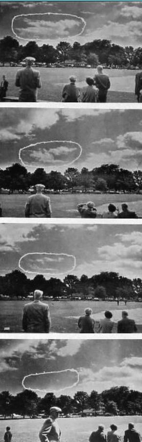 O mago nesta ocasião foi o Dr. Rolf Alexander, um neozelandês que se formou em medicina em Praga e mais tarde tornou-se discípulo do famoso e misterioso filósofo, Gurdjieff. Os observadores de sua demonstração foram o prefeito de Orillia e mais de cinquenta outros cidadãos proeminentes. Além disso, a prova de que o que viram não foi uma ilusão é fornecida por uma série de fotografias independentes da imprensa. A demonstração ocorreu ao ar livre e consistiu em desintegrar e dispersar nuvens pelo poder da mente. Um dos observadores foi solicitado a selecionar um grupo de nuvens cumulus. Isso foi então fotografado. Outro observador foi solicitado a indicar uma nuvem específica desse grupo como alvo. O Dr. Alexander concentrou-se nessa nuvem alvo enquanto os fotógrafos continuavam a tirar fotos em intervalos. O experimento começou às 14h09 e, às 14h17, a nuvem alvo havia se desintegrado e praticamente desaparecido, enquanto outros grupos de nuvens vizinhas permaneciam no céu. Como o Dr. Alexander apontou em seu livro, não pode haver conluio entre um homem e uma nuvem. (“O Poder da Mente”, por Rolf Alexander, MD, Werner Laurie, Londres, 1956).
