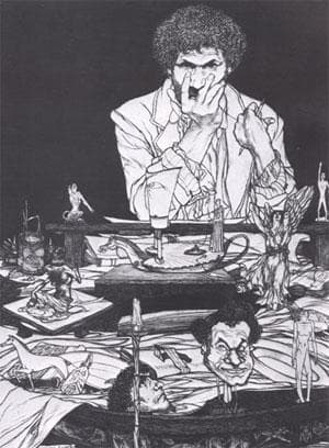 A figura de Zos (o nome Zos não apenas é o nome mágico de Austin Osman Spare, como ele também considera no “Livro do Prazer” que “o corpo considerado como um todo eu o chamo de Zos”) está sentada à uma mesa circular repleta de imagens estranhas. Sua mão direita está pousada em seu rosto, selando a boca e impedindo o fluxo de ar (força vital) através das narinas; seus olhos se concentram com intensidade fixa em VOCÊ – a testemunha. Com sua mão esquerda ele escreve os caracteres místicos que materializam seus desejos sob a forma de “sigilos”. A identidade da mão com a serpente (isto é, phallus) é inequívoca. Ao redor desta figura, encontram-se as inumeráveis imagens de desejos passados, disfarçados sob formas humanas ou bestiais, elementares ou incomuns, algumas delas transfixadas pelo metal do ódio, outras elevadas pela sua mão direita ao local do amor, outras tantas em atitudes de entrega feliz, contemplativa ou sedutora, uma outra brilha através duma máscara impenetrável de êxtase interior, transcendendo a dualidade por um tipo de prazer além da compreensão. Diante de Zos, acima dele e à sua esquerda, encontram-se os crânios dos mortos. O crânio, emblema da morte, está colocado em lugar de destaque, envolto em seus cabelos desalinhados. A idéia é a de que a morte domina o pensamento ou, mais exatamente, todo pensamento é morto, totalmente nulo, e um nada intensamente hipnótico emana de seus olhos fixos no além; e, sob estes olhos, a mão sustenta a cabeça da mesma forma que um pedestal a um cálice.