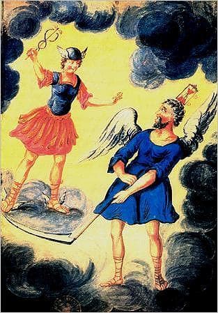 P.77: «Primeiramente, na quarta Lâmina ele pintou um jovem Homem com asas nos calcanhares, tendo uma Vara (caduceu) na mão, com duas Serpentes enroscadas o qual tem um Capacete que lhe cobre a cabeça. A meu ver simboliza o Deus Mercúrio dos Pagãos. Contra ele vem correndo e voando de asas abertas um grande Velho que tem sobre a cabeça um Relógio e nas suas mãos uma foice como a Morte a qual terrível e furiosa ele quer cortar os pés do Mercúrio.»