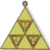 A joia do grau é um delta triplo sobre uma placa triangular de ouro (veja a Figura 2). No centro de cada delta encontram-se os símbolos do sol à direita, da lua à esquerda e mercúrio acima e entre os outros dois [15]. À primeira vista, este símbolo parece representar o tradicional sol, lua e mestre da loja da maçonaria de loja azul. O Mercúrio, conforme conhecido pelos romanos e como Thoth pelos egípcios, o deus Hermes é considerado por Pike como a representação do Mestre da Loja [16]. Mercúrio era o mensageiro das boas novas e o bom Pastor que conduz seu rebanho das terras terrenas às pastagens celestiais. Estas podem ser comparadas às funções que o Venerável Mestre desempenha para manter sua loja em harmonia. No entanto, para os conhecedores da arte do Hermetismo, este símbolo simplesmente grita alquimia.