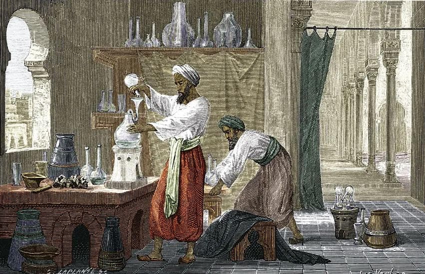 A alquimia, como ficou conhecida no final da Idade Média e no Renascimento na Europa, é claramente uma influência sentida diretamente do mundo muçulmano. A própria palavra é derivada do árabe al-kimiyâ, “a arte da transmutação”. Ela foi tomada emprestada para o árabe do grego χημεια (khêmeia), “a arte (egípcia) da transmutação”. A arte foi atribuída ao Egito, embora a maioria das evidências do que ficou conhecido como alquimia seja derivada de fontes gregas geradas em Alexandria e Harran, um lugar no Oriente para o qual os filósofos pagãos da Grécia fugiram quando os cristãos fecharam suas escolas.