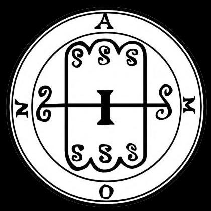 O sétimo espírito é Amon. É um Marques de grande potência. Aparece como de um lobo com a cauda de uma serpente, vomitando flamas de fogo; mas no comando do mágico toma na forma de um homem com traços caninos e cabeça de um corvo; e também como um homem com uma cabeça de corvo ou coruja. Ele mostrará todas as coisas passadas e futuras. Ele reconcilia amizades entre amigos. Ele governa 40 legiões de espíritos. Seu selo é este que deve ser preparado como acima dito.