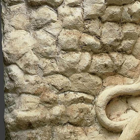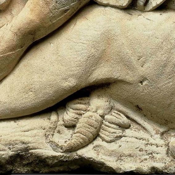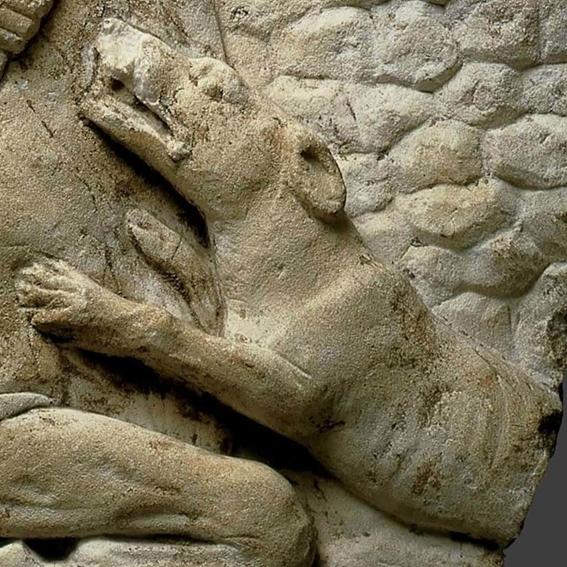 Mithras tinha um cão fiel que o ajudou na captura do touro selvagem. O cachorro é visto na borda inferior direita sobrevivente. O corpo do cachorro está faltando seu traseiro. Portanto, o friso sobrevivente está incompleto, como suportado pelo corpo desaparecido e bordas irregulares. Originalmente, o friso teria incluído todo o corpo do cão no drama de matar. Como você acha que a cauda do cão teria parecido enquanto o cão se pulou para a frente em direção ao touro?