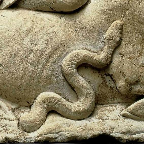 Logo abaixo da facada fatal do touro está uma cobra de aparência de píton. Ele levanta a cabeça e move sua língua serpente em direção ao corte. A cobra foi enviada pelo deus indiano-persa do mal, Ahriman, para impedir o nascimento da planta de uva benéfica. Ahriman instruiu a cobra a lamber e engolir o sangue choroso do touro. A língua da cobra se aproxima do corte para capturar o sangue que escapa. No entanto, a cobra não teve sucesso quando algumas gotas de sangue atingiram o chão abaixo e as uvas começaram a crescer imediatamente. A tentativa de sabotagem de Ahriman falhou! Mithras Matando o Touro retrata esta imagem do fracasso do mal.