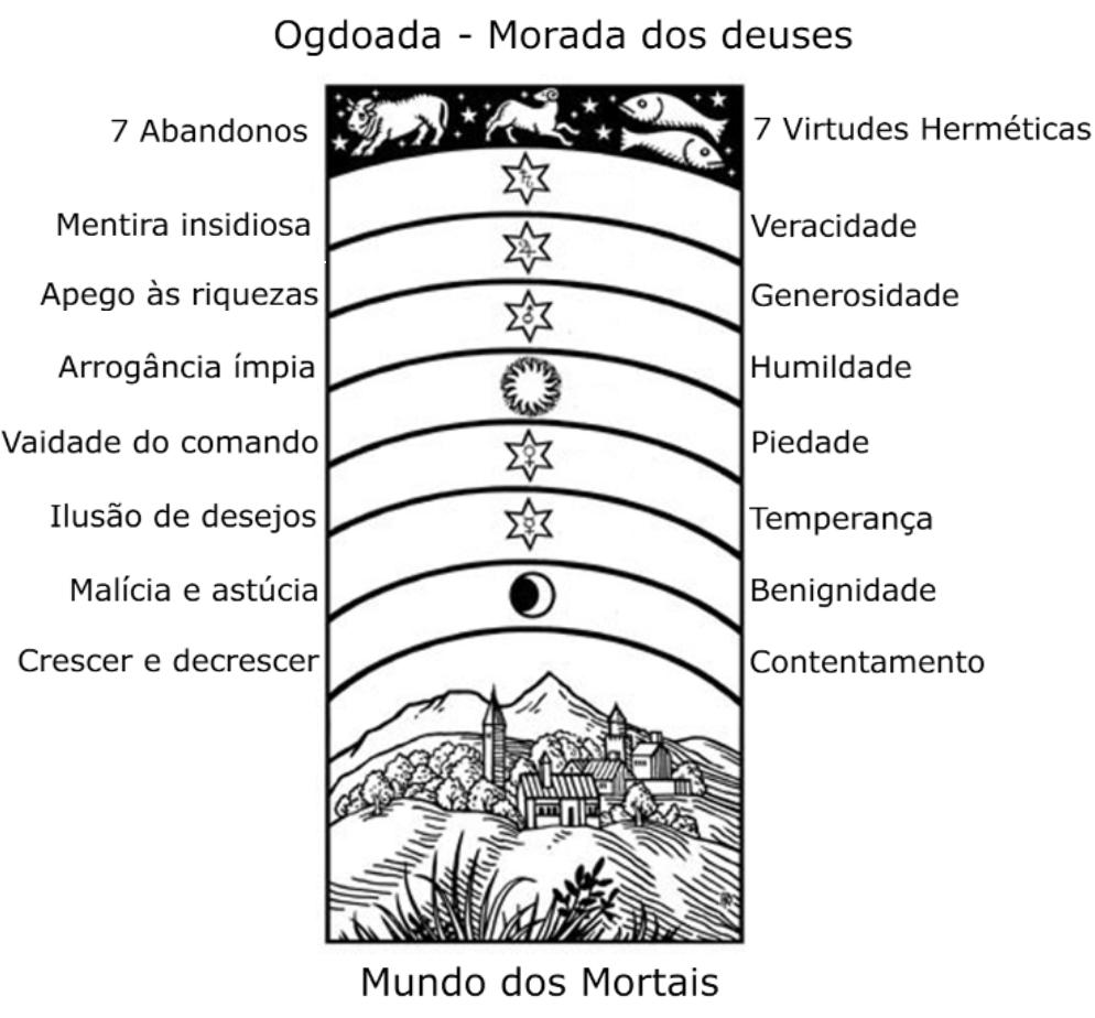 “E desta maneira o ser humano se eleva para o alto através dos círculos das esferas. Na primeira região ele abandona a potência, de crescer e de decrescer; na segunda o artifício do mal e da astúcia, então impotente; na terceira a ilusão dos desejos, a partir de então impotente; na quarta a vaidade do comando que já não pode ser satisfeita; na quinta, abandona-se a audácia ímpia e a audácia temerária; à sexta o apego às riquezas, então sem efeito; na sétima a mentira insidiosa.”
