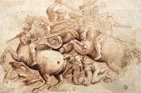 “A batalha de Anghiari” foi vista como um monumento às paixões da guerra e uma declaração anti-guerra apaixonada: os rostos dos homens selvagemente retorcidos, os cavalos arrancando a carne uns dos outros, um cavalo gritando de dor, algo como uma “Guernica ” do Renascimento. Exatamente quando ele estava se preparando para começar a pintura em si, o governo da cidade contratou Michelangelo para pintar outra parede na mesma sala, estimulando deliberadamente uma competição entre os dois maiores artistas de Florença.