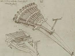 Uma carruagem equipada com enormes lâminas giratórias, cortando homens ao meio ou cortando as pernas fora deixando pedaços espalhados; armas com vários canos dispostos como tubos de órgão para aumentar a velocidade e intensidade dos disparos; uma colossal balestra lançadora de mísseis. Leonardo fez muitos desenhos tão assustadores enquanto era empregado de Ludovico, que ganhou o título de duque de Milão só depois de envenenar seu sobrinho, alguns anos depois, mas que efetivamente desempenhou aquele papel durante os dezessete anos que Leonardo passou na cidade. Em parte, porque a reivindicação de Ludovico era instável, Milão estava sob cerco frequente por potências concorrentes, e Leonardo lhe ofereceu suas habilidades: “Eu tenho métodos para destruir qualquer fortaleza ou reduto, mesmo que seja fundado em rocha sólida” – que parece tanto oportunista quanto fantástica, como os desenhos. Ele nunca demonstrara habilidade militar antes, e sua intenção nesses desenhos continua sendo uma questão discutida. Ele era um visionário não mundano ou um inventor consciencioso? Isaacson quer as duas maneiras: “Eu acredito que sua proposta era séria”, ele escreve sobre a temível balestra, apontando para cerca de trinta desenhos preparatórios, mas ele acredita que o design era, no entanto, “uma obra mais de imaginação que de invenção”, pela simples razão de que não seria funcionado – e não funcionou, mesmo quando construída por engenheiros modernos, para a televisão, em 2002. Este argumento encobre a questão da intenção, mas sugere as complexidades envolvidas em fazer quaisquer julgamentos morais sobre o homem.