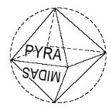 ² O cubo ABRACADABRA se torna um Octaedro após criação da esfera, pois ao final de um ciclo completo, as quatro faces da criação em suas vértices e arestas superiores se unem em um ponto só acima do topo da cabeça do mago, centralizando os quatro elementos na quinta essência, formando uma pirâmide voltada para cima – do chão ao coronário – e uma voltada para baixo – dos pés para abaixo do nível do chão, logo um Octaedro. Essas duas pirâmides correspondem ao contraponto uma da outra, tal como a esfera contrapõe o disco (a esfera protege e o disco destrói) assim também trabalham essas energias opostas das pirâmides, equilibrando e estabilizando o ambiente, como a própria etimologia da palavra pirâmide propõe: Pyra = Fogo, Midas = Medida, algo como “A medida correta do Fogo “, seja ele externo (Macrocosmo) ou Interno (Microcosmo).