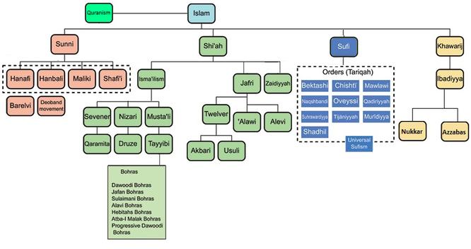Diagrama que mostra as derivações do Islam em Coranismo, Sunismo, Xiismo, Ibadismo, Ahmadiyya e Sufismo, além de outros ramos conforme a adição de novas autoridades religiosas além do Alcorão.