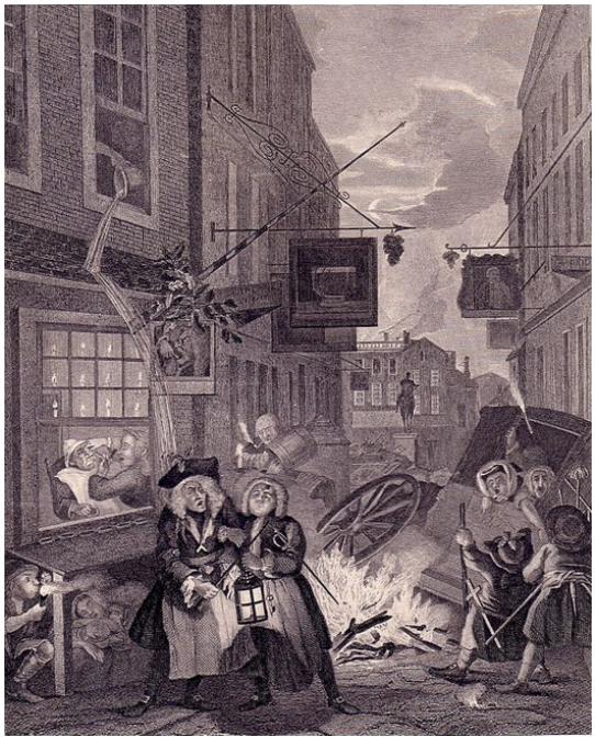 Esta figura é de autoria do artista e maçom William Hogarth. Feita em 1738, é a última de uma série de quatro pinturas intitulada de “Four Times of the Day”, que pode ser livremente traduzido como “Quatro momentos do dia” e que ilustram cenas de um dia comum em Londres naquela época. A primeira pintura era a “manhã”; a segunda, “meio-dia”; a terceira, “tarde”; e esta, a quarta e última, “noite”. Ela é de relevância à Maçonaria por ilustrar um Venerável Mestre (título relativo a presidente de uma Loja Maçônica) embriagado, sendo auxiliado a andar pelo Cobridor (em inglês, “tyler”, que corresponde ao guarda da reunião).