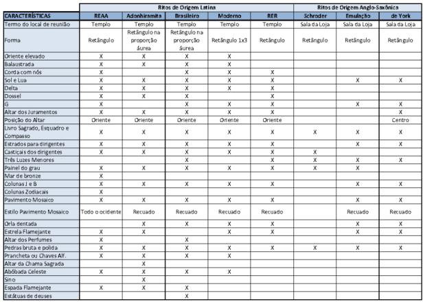 Quadro 1: Quadro Comparativo de características e elementos nas Salas e Templos dos diferentes ritos maçônicos praticados no Brasil.