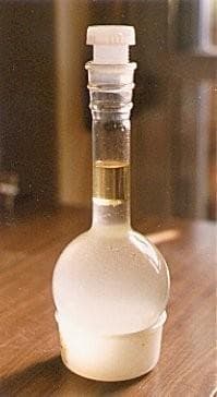Quando o destilado atingir mais de metade da altura da pança do recipiente, podereis observar uma fina camada oleosa por cima da água, com a espessura de 2 ou 3 mm. Continuai a destilação até que o óleo essencial atinja cerca de metade do colo. Então, desligai o forno. Com a temperatura remanescente, o vosso destilado atingirá o cimo do recipiente.