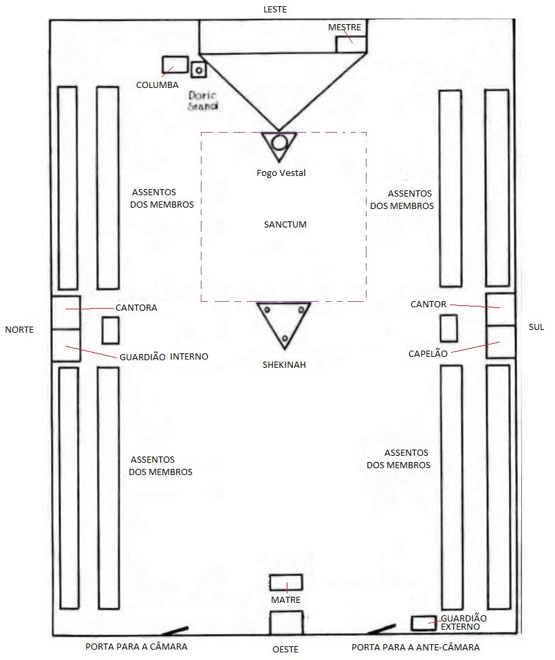A Câmara do Templo: Esta é uma outra sala que dá acesso a loja mas que permanece oculta acessível por uma passagem secreta na Antecâmara. Aqui entre outras coisas ocorre a primeira parte da primeira iniciação é conduzida. É a tumba do Silêncio, o Abismo das Trevas, o Local do Terror. Isso é tudo que pode ser dito.