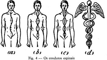 Na índia chamam Bramadanda, ou bastão de Brama, à espinha dorsal, e o desenho representado na figura 4d demonstra que também é o original do caduceu de Mercúrio com as duas serpentes que simbolizam o kundalini ou serpente ígnea, que se move ao longo do canal medular, enquanto que as asas representam o poder, conferido pelo fogo, de se elevar aos planos superiores.