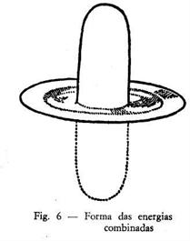 A figura 5 da idéia destas disposições. A e B são as formas adotadas pela energia primária; C é a do glóbulo de vitalidade; e D a do kundalini. E mostra o efeito da combinação A e D; e F o da de B e D, Nas formas A, B e C o átomo central está constantemente vibrando em ângulo reto com a superfície do papel, salta dela até uma altura maior que o diâmetro do disco, e depois se afunda debaixo do papel a igual distância, repetindo várias vezes por segundo este movimento de lançadeira*.