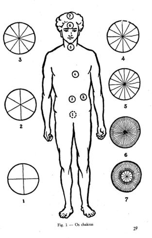 As figuras expostas mais abaixo indicam toscamente o modo como as forças etéricas fluem através do corpo humano. O ida sai da base da espinha dorsal, à esquerda do sushumna, e o pingala à direita (bem entendido, à esquerda e à direita do homem e não do espectador; mas na mulher estão invertidas estas posições). As linhas terminam na medula ablongada.