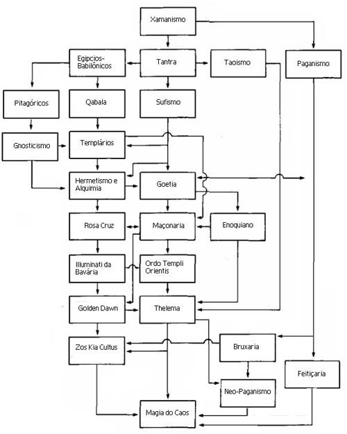 Resposta: O gráfico no Liber Null foi criado para mostrar o desenvolvimento de certas tradições de idéias esotéricas: cada um dos grupos parece ter tirado sua inspiração de um ou mais grupos mais antigos. Cada grupo pode ser considerado o Illuminati de sua época no sentido de possuírem as chaves para o próximo grau de iluminação. Isso, eu acredito, é tudo o que pode ser dito sobre os Illuminati e eu gosto de pensar que a Magia do Caos é obviamente a corrente esotérica da era pós-moderna.