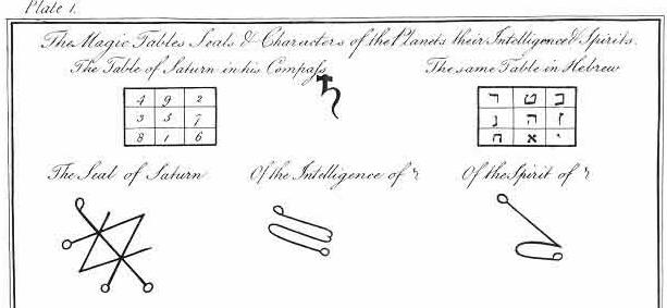 Sem problemas. É um erro comum. O segundo símbolo que você vê aqui é comumente referido como “Sigilo de Azazel” nos dias de hoje na internet. Até mesmo é visto em joias agora como um “Sigilo de Azazel!” Mas a questão é que esse símbolo simplesmente não é um sigilo de Azazel. É o selo planetário de Saturno, conforme apresentado pelos Três Livros de Filosofia Oculta de Cornelius Agrippa e reproduzido em O Mago de Francis Barrett. Na verdade, está na mesma página do sigilo de Zazel, como visto claramente aqui: