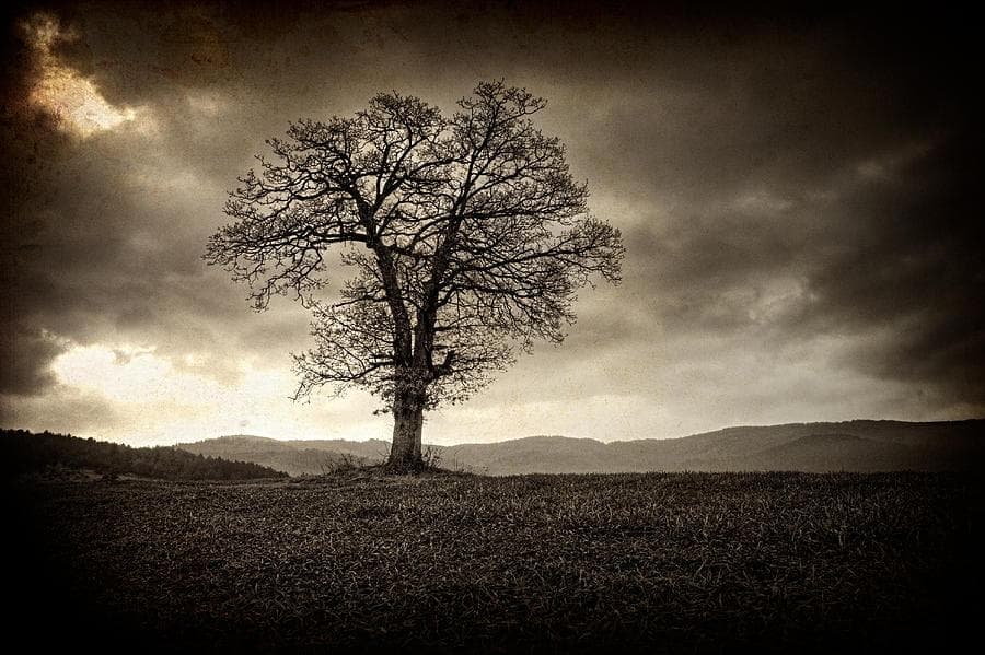 Uma árvore sem folhas negra no luar azul. O som de respiração difícil. O cheiro de terra recém cavada. Um céu branco se torna vermelho.