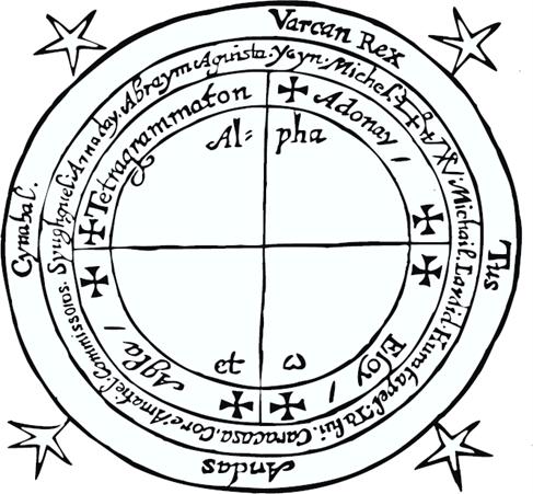 b: (1 pé = 12 polegadas, ou 30,48 cm). Um exemplo é dado após a conjuração; atualmente, quatro círculos concêntricos precisam ser desenhados, dando três voltas em torno da parte exterior, no qual se escreve os nomes.