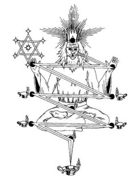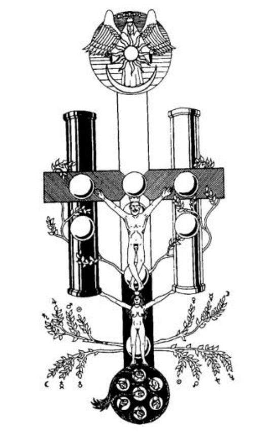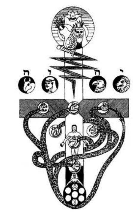 Na parte inicial desse ritual, o candidato é amarrado simbolicamente a uma cruz (que simboliza os elementos). Essa subordinação voluntária do ego ao Eu Superior finalmente libera o ego do ataque violento dos complexos inconscientes. Isso é simbolizado pela queda das cabeças do dragão do Sephiroth (mostrado abaixo)