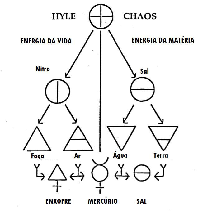 É somente no texto alquímico “A Corrente Dourada de Homero”, que encontramos algumas explicações sobre este assunto. Neste texto, a energia da vida é chamada de “Nitro” e a energia da matéria é chamada de “Sal”. Então, a primeira energia, a energia da vida por sua vez é dividida e dá os 2 primeiros elementos: Fogo e Ar. Da mesma forma, a primeira energia da matéria é dividida e dá os outros dois elementos: Água e Terra.