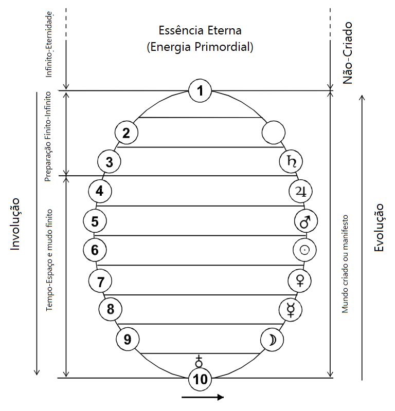 Tudo na Natureza passa primeiro por uma fase de involução e depois por uma fase de evolução. Na origem, o homem é um ser eterno em potencial, mas pode, de repente, partir do ponto-semente primordial para o Ser realizado do fim dos tempos. Essa mudança ocorre em etapas. O homem necessariamente desce a mundos mais densos até chegar ao nosso: é a fase de involução. Quando as estruturas apropriadas estiverem preparadas, o homem pode iniciar a viagem de retorno. Esta é a fase evolutiva, o caminho da reintegração. Esta viagem, em ambas as direções, é realizada em dez passos que correspondem a dez níveis de consciência no homem, os dez níveis de energia da Criação.